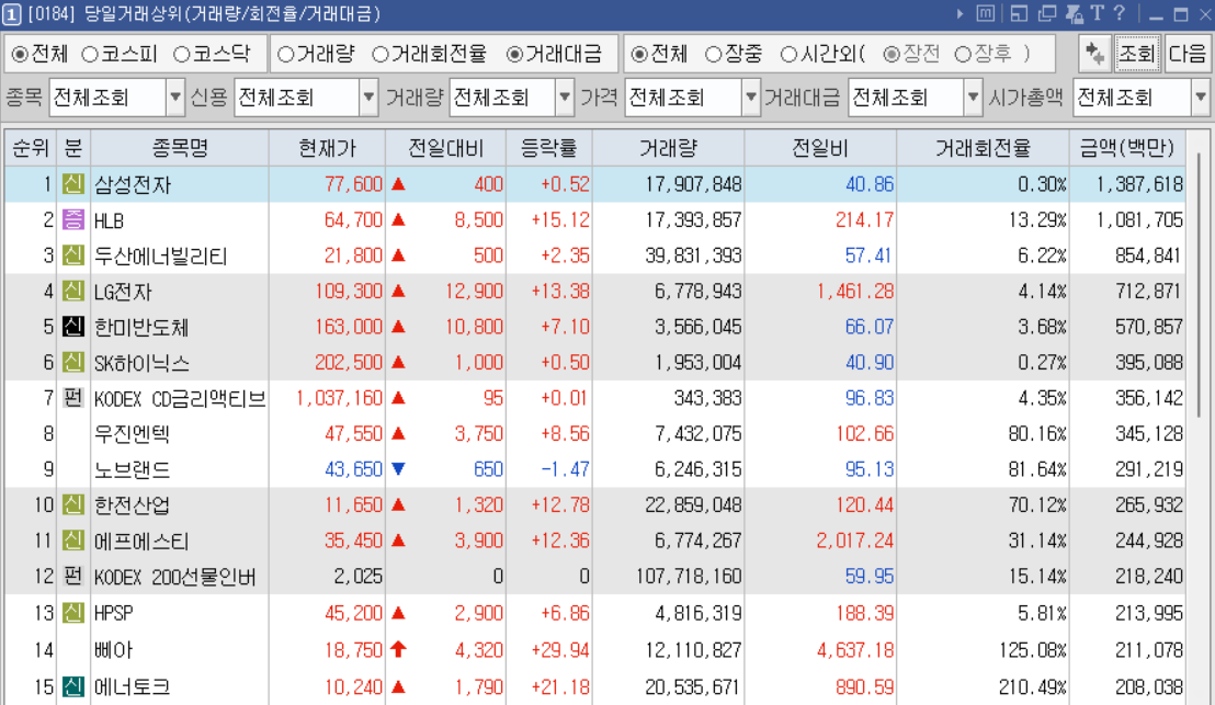 오늘 거래대금 상위 종목을 보시면 반도체 섹터와 원전관련주 화장품이 보이고 최근 신규상장주인 노브랜드 종목이 보입니다. 이종목은 연속하락에 따른 반등이 나왔지만 결국 하락 마감을 했습니다.