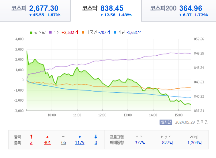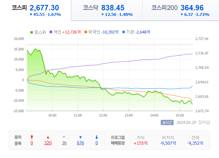 코스피 지수는 전날보다 45.55(1.67%) 2677.30으로 크게 하락 마감했습니다.