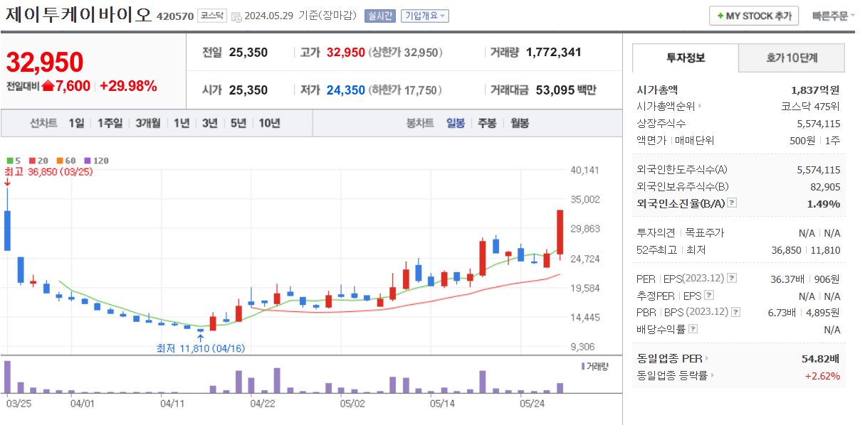 오늘 상한가 이유로는 2024 바이오 USA 참가 이슈와 함께 미국 자회사에 기술이전 신약공동개발 이슈와 함께