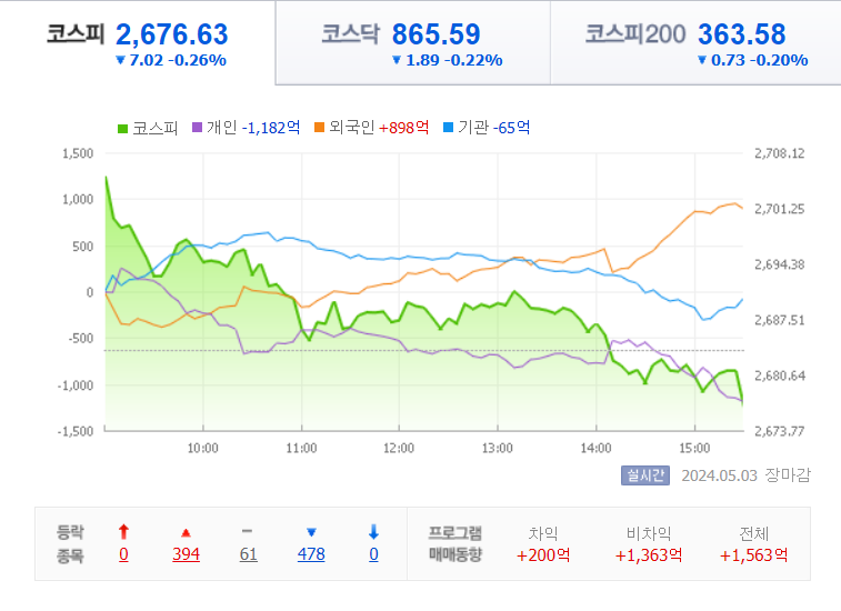 코스피 지수는 전날보다 7.02(0.26%) 하락한 2676.63으로 마감을 했습니다.