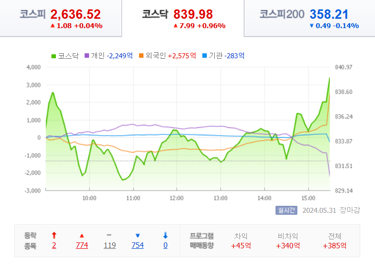 코스피 지수는 전날보다 1.08(0.04%) 상승한 2636.52로 장을 마쳤습니다.