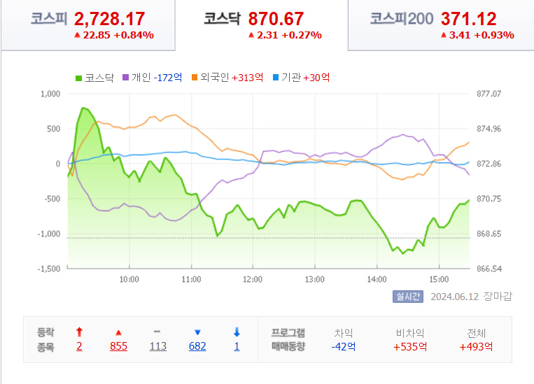 코스피 지수는 전날보다 22.85(0.84%) 상승한 2728.17로 장을 마쳤습니다.