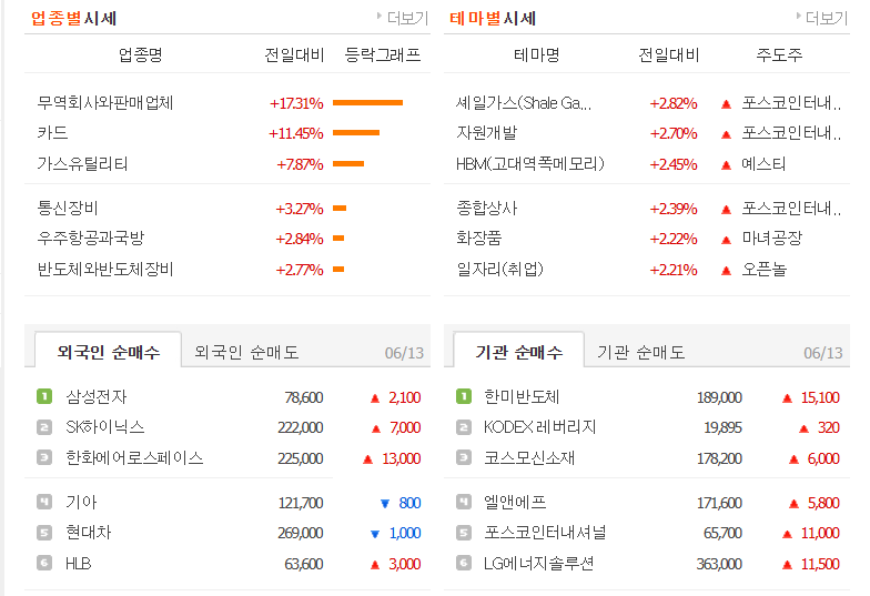 오늘은 미증시 영향으로 반도체 섹터, 화장품, 우주항공, 가스관련주가 상승을 했습니다.