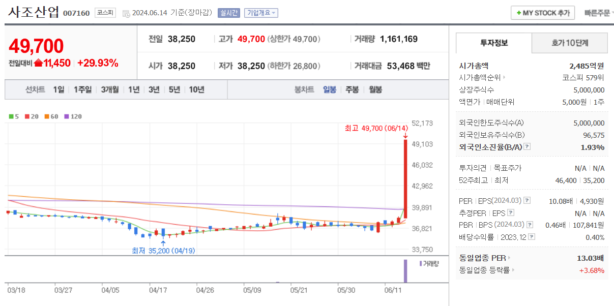 오늘 상한가 이유는 같은 이유로 사조 그룹주 동반 상한가 마감을 했습니다.