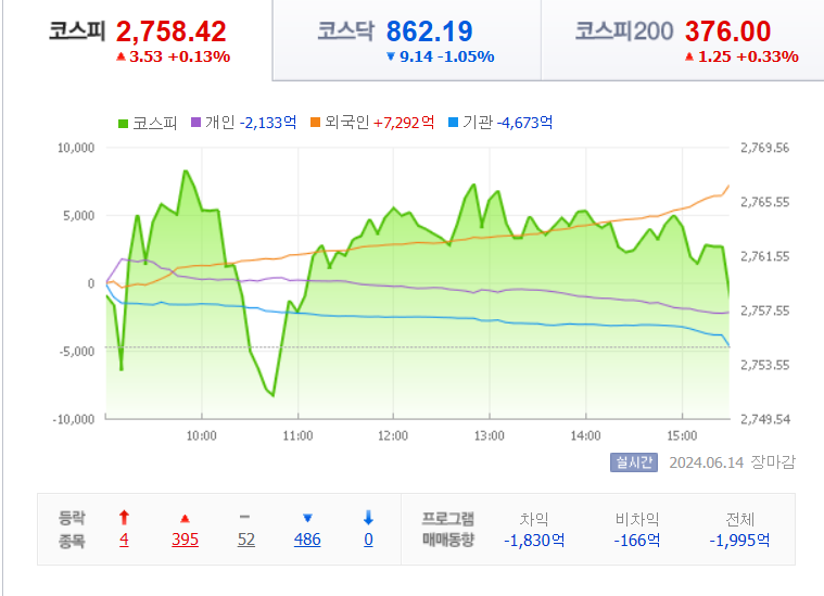코스피 지수는 전날 보다 3.53(0.13%) 상승한 2758.42로 장을 마쳤습니다.