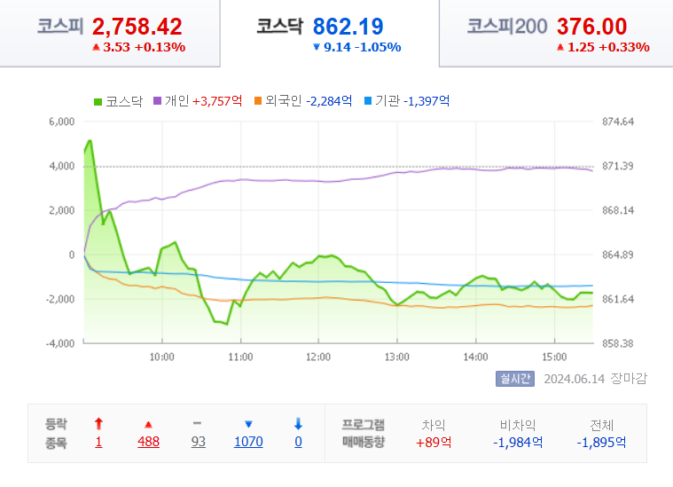 강보합 마감을 했습니다. 거래대금은 15조 7252억 원으로 어제보다 3조원 넘게 줄면서 마감을 했습니다.