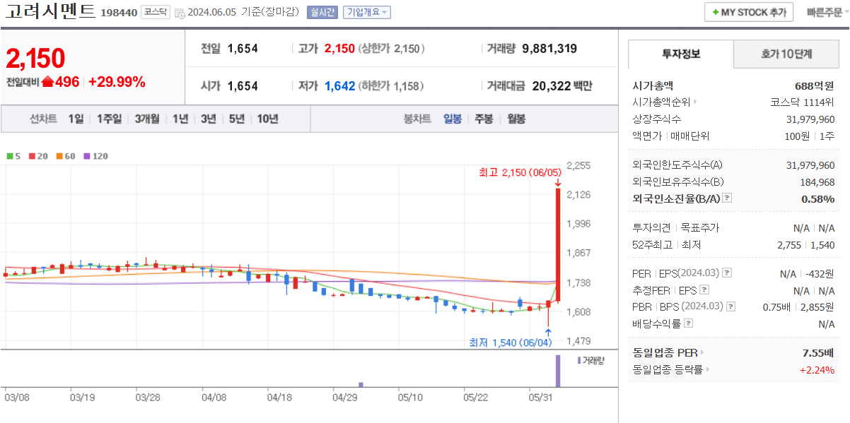 시멘트 - 고려시멘트(상한가), 삼표시멘트(17.50%), 성신양회(5.11%), 한일시멘트(4.44%)