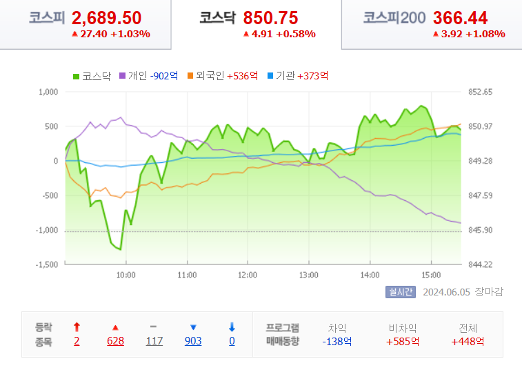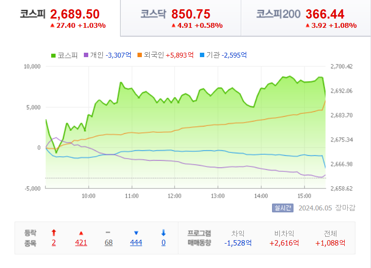 코스피지수는 전날보다 27.4(1.03%) 상승한 2689.50으로 장을 마쳤습니다.