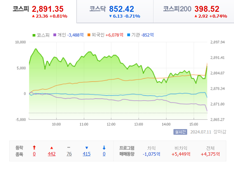 외국인이 6078억 원 순매수를 했고 기관과 개인이 각각 852억 원, 3488억 원 순매도를 했습니다.