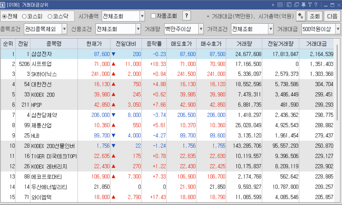 오늘 상위종목을 보시면 신규상장한 종목 시프트업이 18% 상승을 했지만 시초대비 하락하면서 음봉 마감을