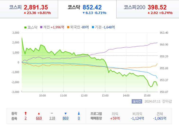 하락 마감을 했습니다. 코스닥 지수는 전날 보다 6.13(0.71%) 하락한 852.42로 장을 마쳤습니다.