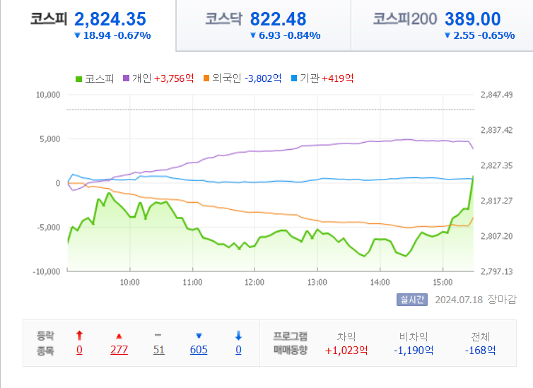 코스피 지수는 전날보다 18.94(0.67%) 하락한 2824.35로 장을 마쳤습니다.