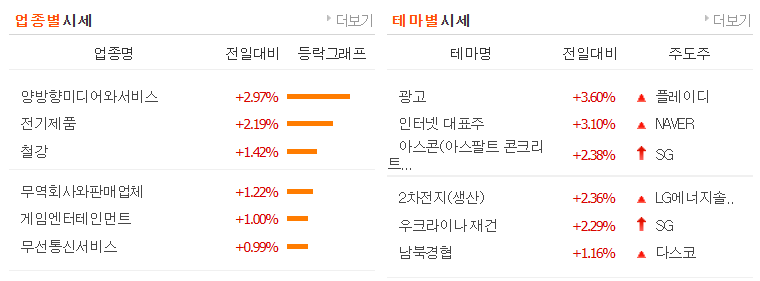 오늘 시장 미증시 영향으로 큰 폭으로 양시장 하락을 했습니다. 그중에서 상승 섹터는