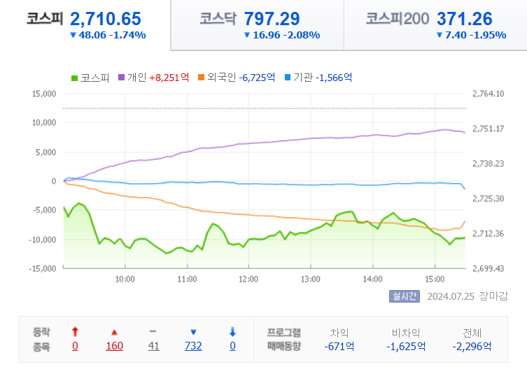 코스피 지수는 전날보다 48.06(1.74%) 하락한 2710.65로 장을 마쳤습니다.