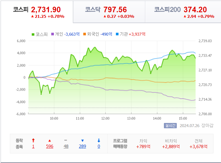기관이 3937억 원 순매수를 했고 외국인과 개인이 각각 490억 원, 3663억 원 순매도를 했습니다.
