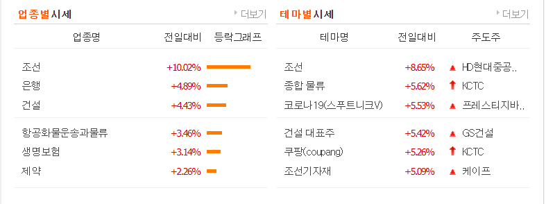 크게 상승 마감을 했습니다. 그리고 제약, 은행, 재건 관련 그리고 위메프, 티몬 이슈로 반사이익 관련주가