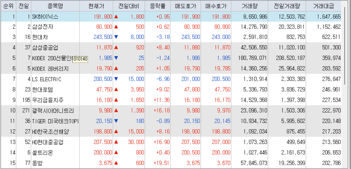 거래대금 상위종목을 보시면 조선주들이 상위로 올라왔습니다. 삼성중공업, HD한국조선해양, HD현대중공업