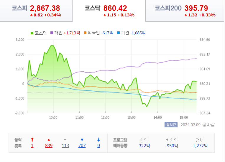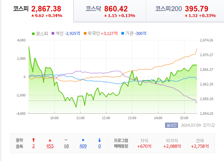 코스피 지수는 전날 보다 9.62(0.34%) 상승하면서 2867.38로 장을 마쳤습니다.