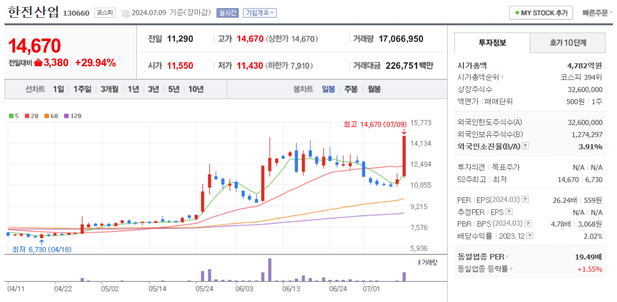 오늘 상한가 이유는 30조 규모 체코 신규 원전 수주에 대한 기대감으로 이종목 상한가 마감을 했습니다.