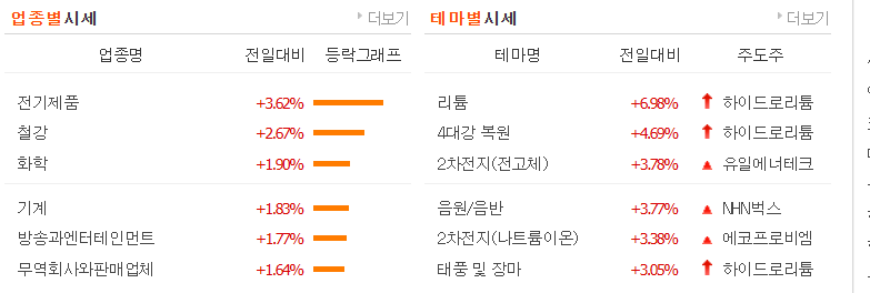 오늘의 주식 시장 정리( 주도 테마 및 섹터)