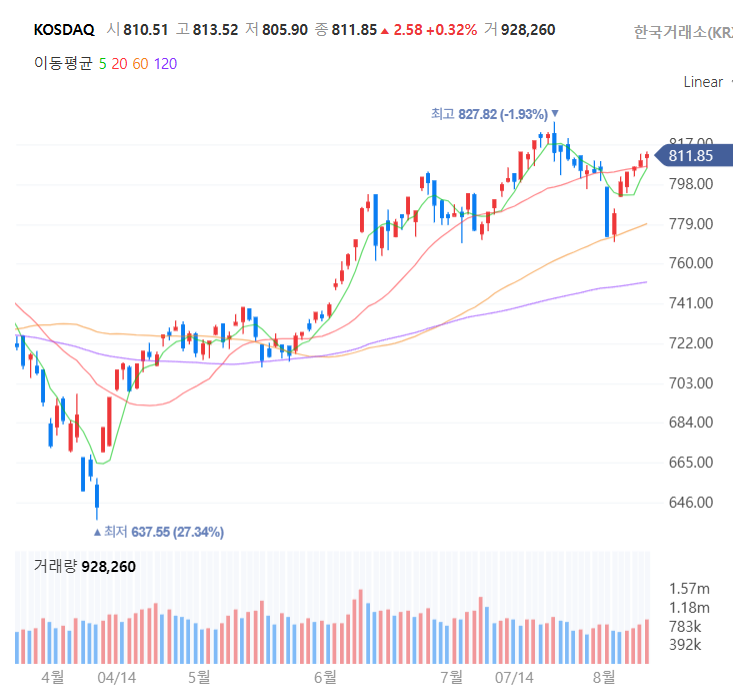 코스닥 지수는 0.32% 상승한 811.85로 마감. 외국인과 기관이 각각 553억, 421억 순매수.