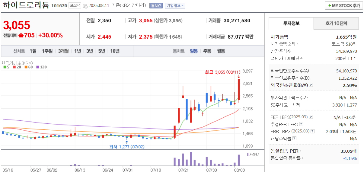 이종목은 지난달 부터 리튬관세 이슈로 상한가를 2번 연속 나왔고 오늘 다시 리튬이슈로 고점 돌파가 나옴.