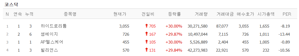 상한가 섹터는 리튬, 신사업인 코인사업 이슈로 썸에이지, AP헬스케어 상한가 마감.