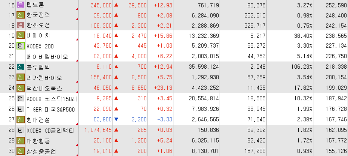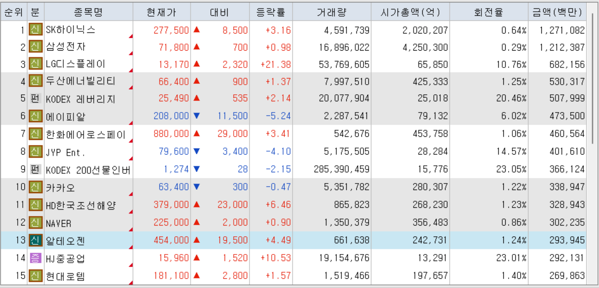 오늘의 거래대금 상위 종목