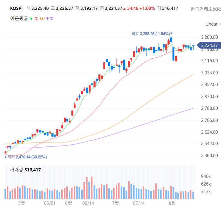 코스피 지수는 1.08% 상승한 3224.37로 마감. 외국인이 6348억 순매수, 기관이 809억 순매도.