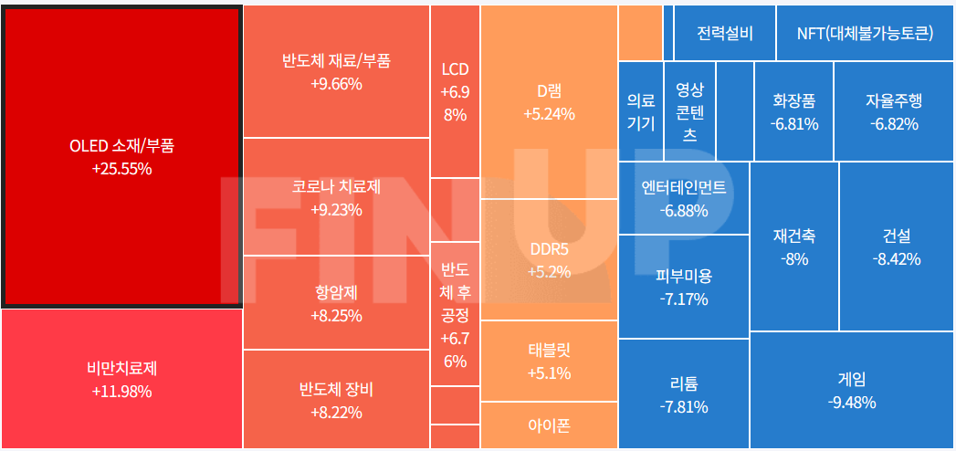 OLED 관련주가 크게 상승을 보였고 비만치료제 관련주도 크게 상승`마감.