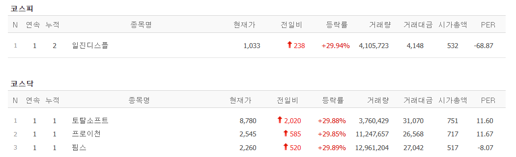 오늘 상한가 종목은 4 종목임. 일진디스플레이, 프로이천, 핌스 3 종목 모두 시총이 낮은 종목이지만