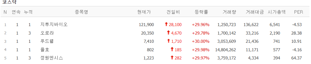 오늘의 상한가 종목