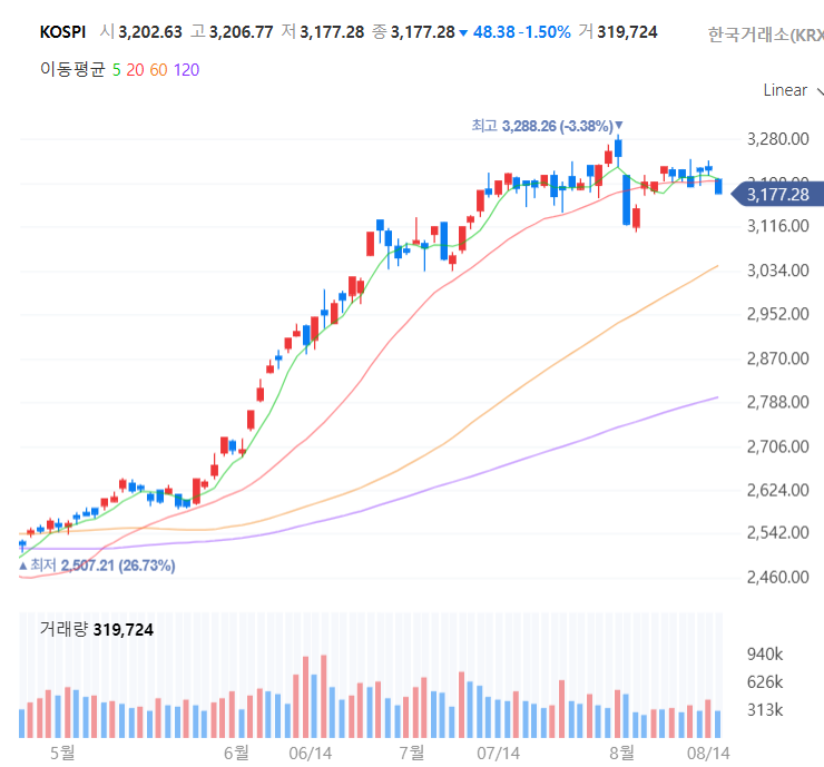 코스피 지수는 1.5% 하락한 3177.28로 마감. 외국인이 5402억 순매도, 기관이 791억 순매수.