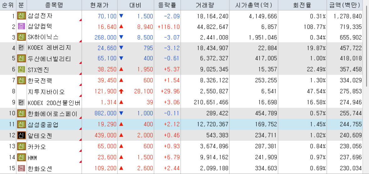 오늘의 거래대금 상위 종목