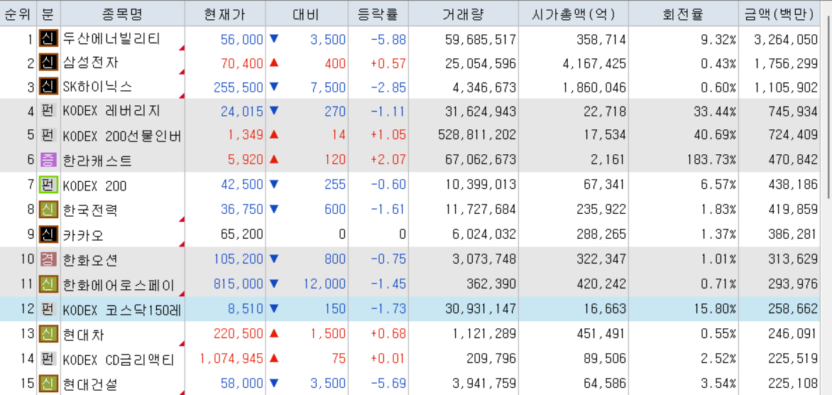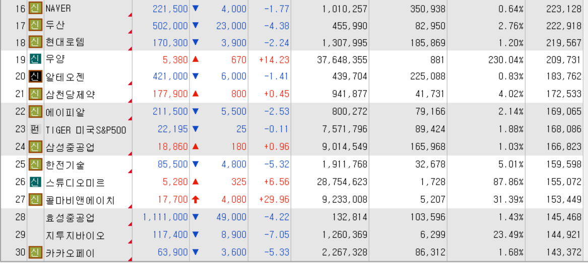 거래대금은 4조 9903억 으로 전날보다 7천억 가량 줄어듦.