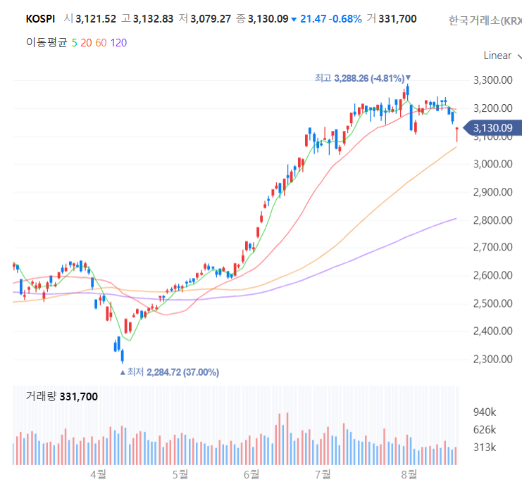코스피 지수는 엔디비아 하락과 잭슨홀 경계감이슈에 하락출발 크게 하락을 보였지만 기관 순매수에