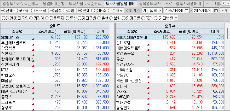 오늘 거래대금 상위 종목에서 원전, 신규상장주, SK하이닉스 , 방산주가 하락함.