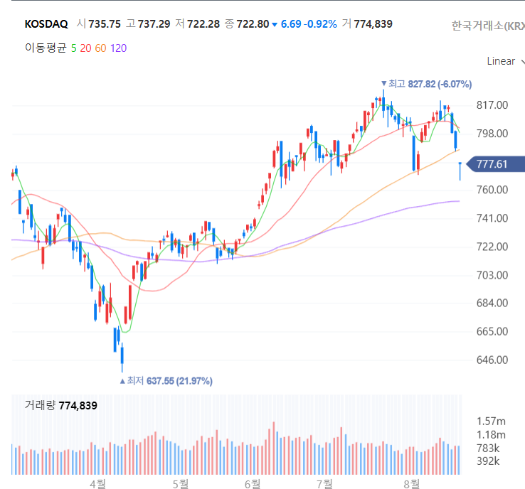 오늘 코스닥 지수도 미 AI 거품론 이슈와 함께 하락 출발 장중 2% 넘게 하락을 보였지만 낙폭을 줄이면서 마감.