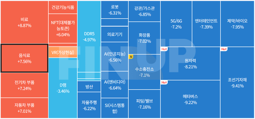 오늘의 특징주 섹터는 음식료, 엔터, 콜마그룹주, 개별이슈 등임.