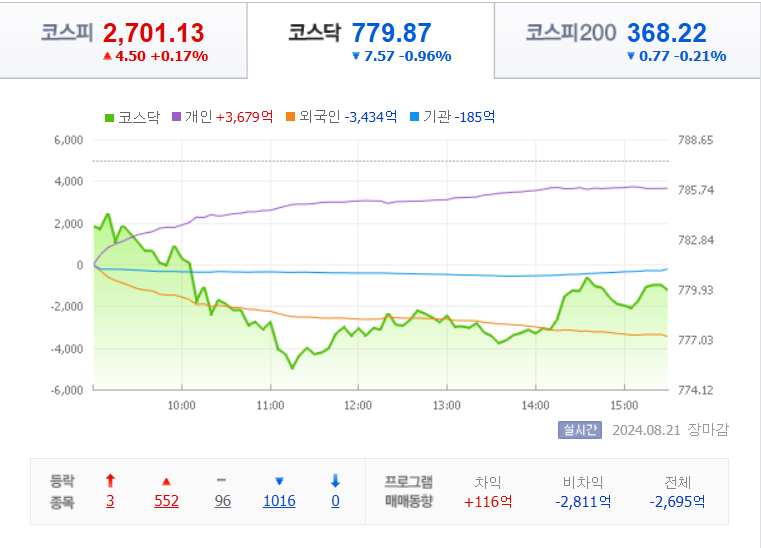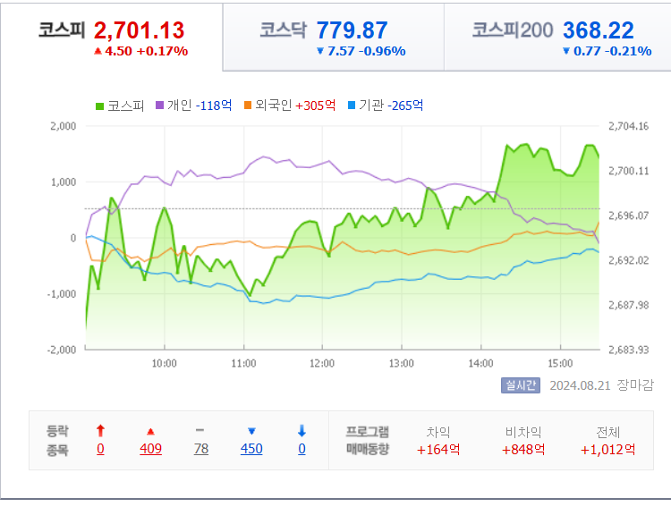 코스피 지수는 전날보다 4.50(0.17%) 상승한 2701.13으로 장을 마쳤습니다.