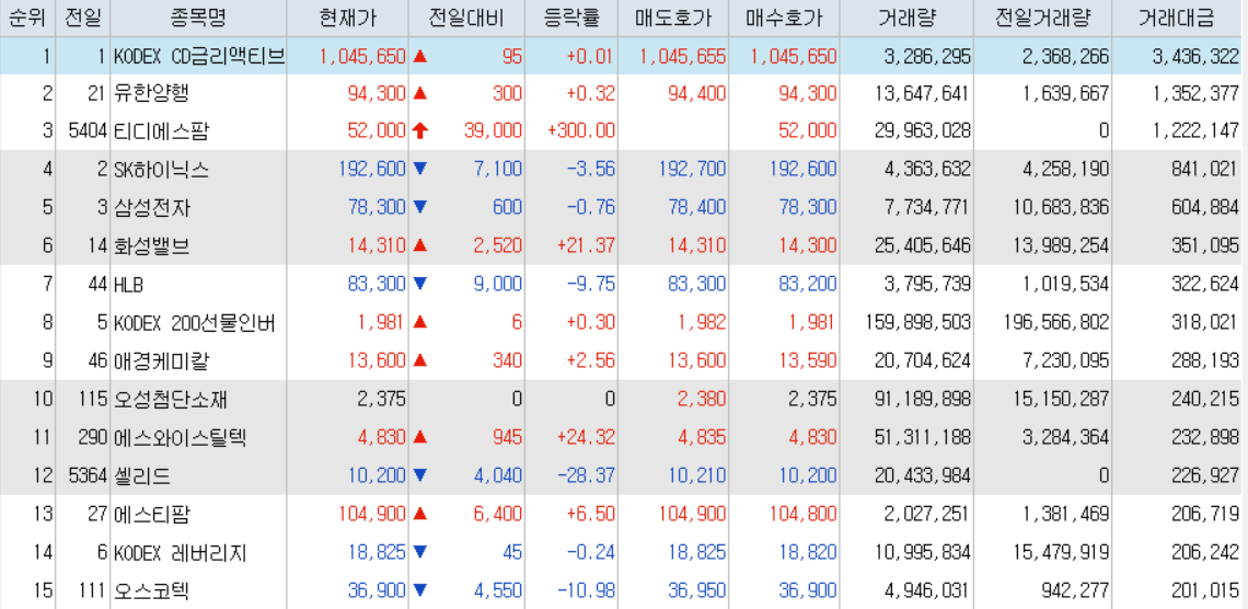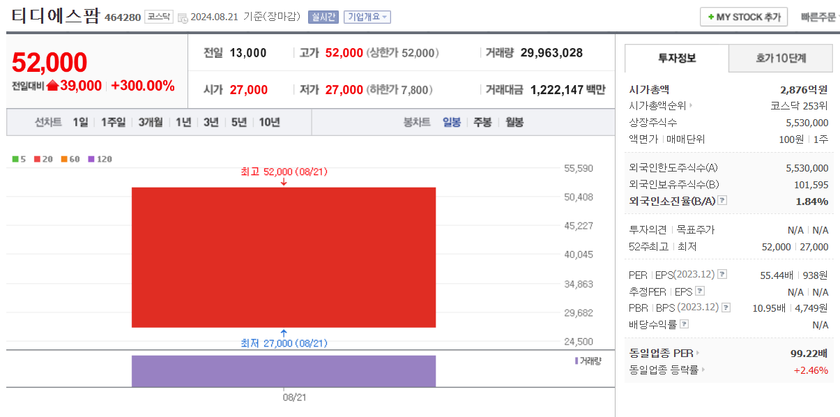 했는데 거래량동반 상승분을 반납하면서 상위에 올랐고 신규상장주 티디에스팜 종목은 300% 상승 마감