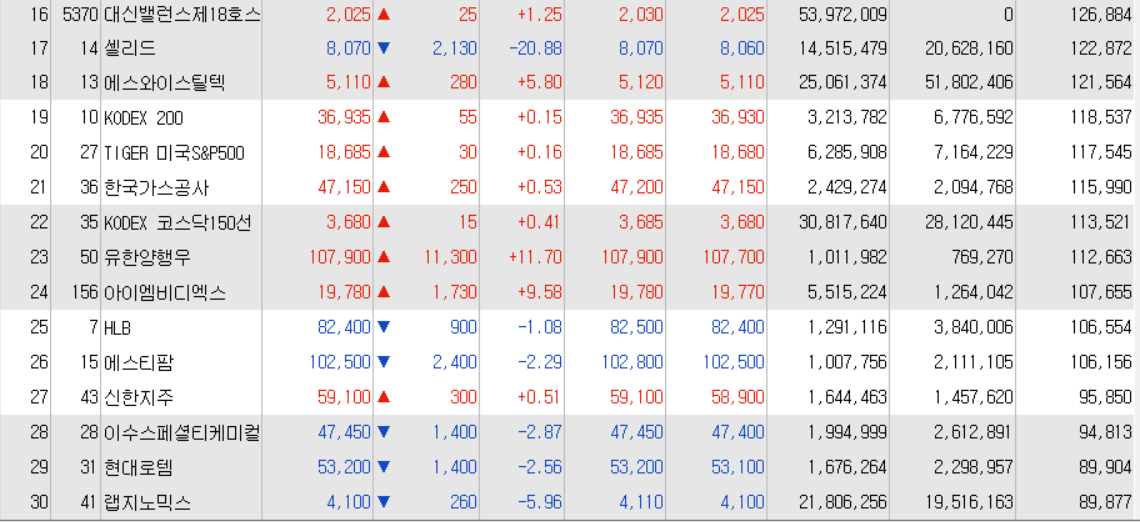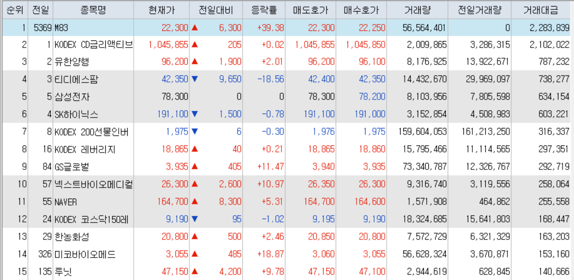 오늘 거래대금 상위종목에서는 신규상장주인 M83 종목이 2조 2800억 원 거래대금이 나오면서 1위를 했는데