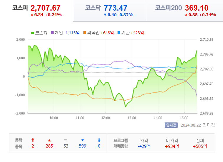 유입되면서 강보합 마감했습니다. 코스피 지수는 전날보다 6.54(0.24%) 상승한 2707.67로 장을 마쳤습니다.
