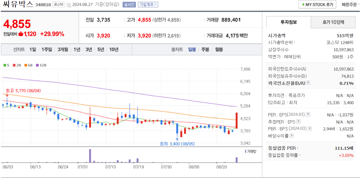 다만 워낙 평소거래량이 적은 종목이고 시총 또한 작은 종목이라서 적은 거래량으로 상한가 마감을 했습니다.