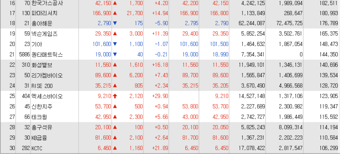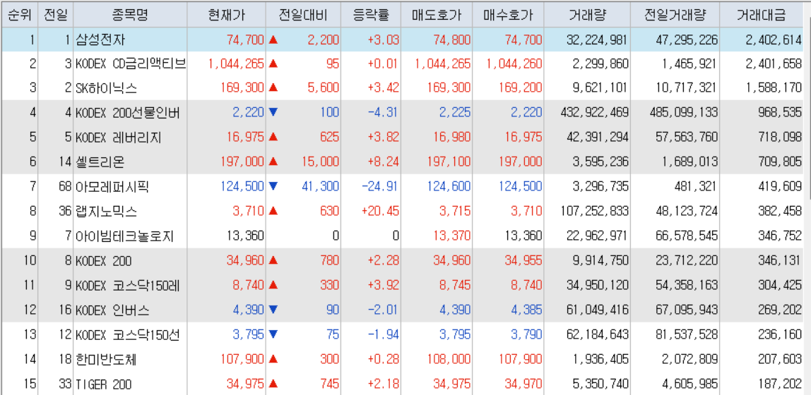 거래대금 상위종목에 반도체, 화장품, 금융, 바이오주가 상승을 했고 화장품주인 아모레퍼시픽 주가가