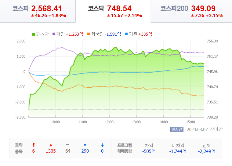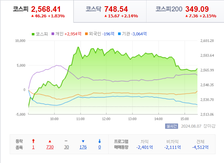 코스피 지수는 전날보다 46.26(1.83%) 상승한 2568.41로 장을 마쳤습니다.