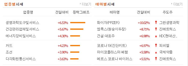 오늘 시장은 하락으로 출발해서 하락 마감을 했지만 계속되는 코로나 이슈로 관련주들이 오늘도 크게 상승을 했고 조선주, 풍력주가 크게 상승을 했습니다. 반도체 관련주는 미 반도체지수 하락에 따라 크게 하락했네요.