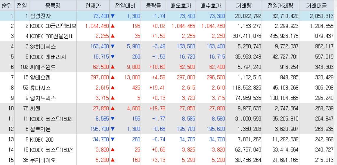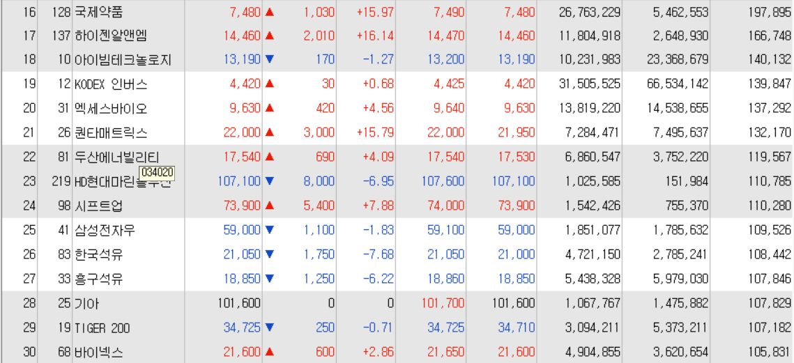 거래대금 상위종목을 보시면 진단키트 관련주가 거래대금 상위종목으로 오면서 크게 상승을 했고 석유관련주가 크게 하락을 했습니다.