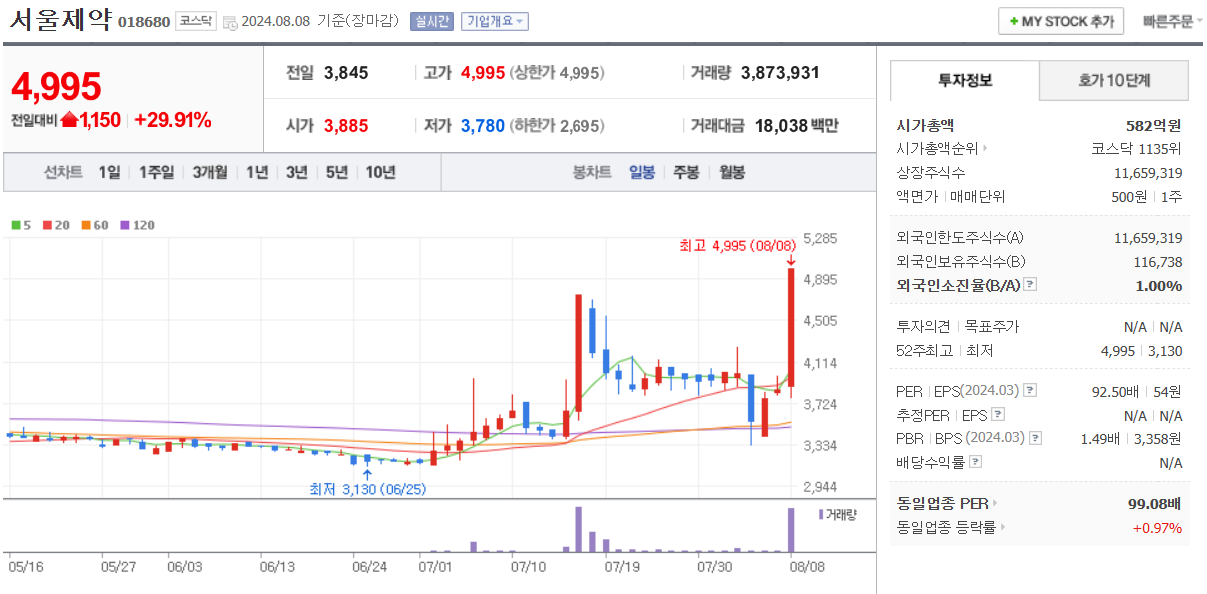 오늘 상한가 이유로는 코로날 재확산 엠폭스 재확산에 따라서 수급동반 상한가 마감을 했습니다.