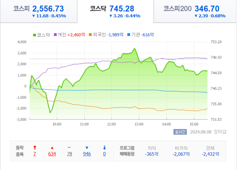 외국인과 기관이 각각 1989억 원, 616억 원 순매도를 했고 개인이 2459억 원 순매수를 했습니다.